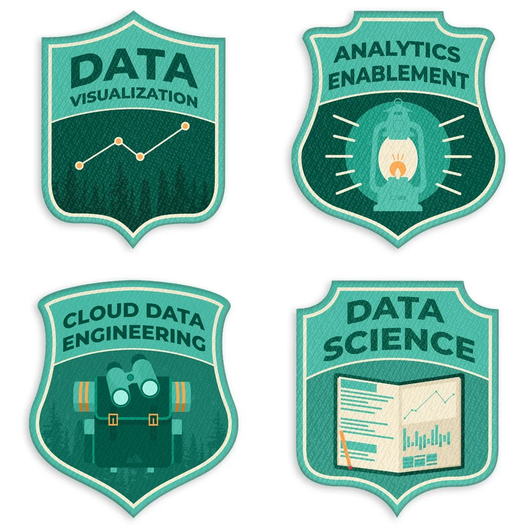 After creating the values patches, I developed our service-offering badges to represent DataDrive’s areas of expertise. Inspired by the badges worn by park rangers, they evoke a sense of expertise, ownership, and agency.