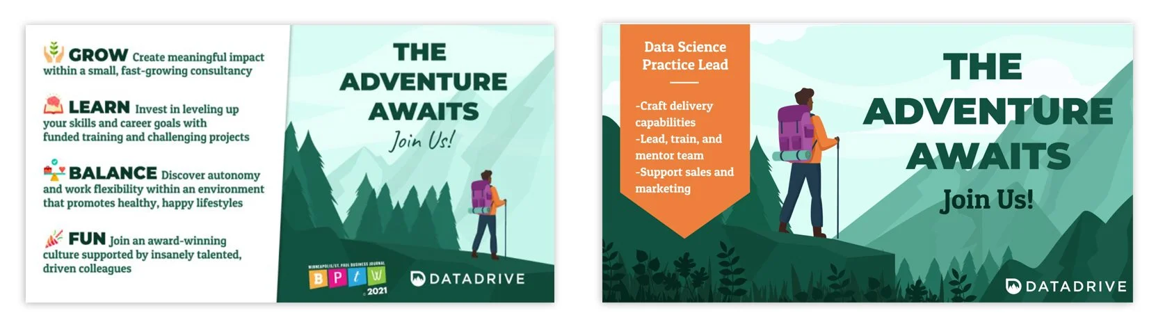 For our recruiting content, we chose to once again highlight our adventure-theme, as joining DataDrive was an adventure. We utilized our chosen brand illustration style for these graphics. This illustration style is used in all DataDrive blogs.